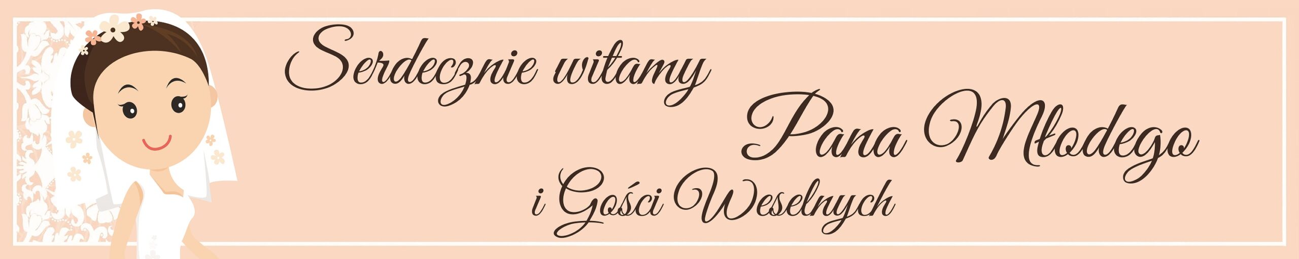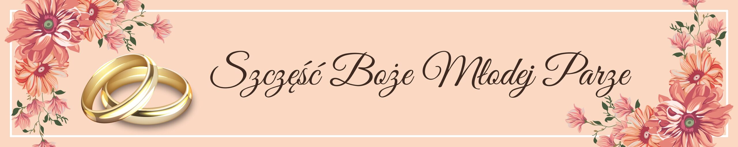 baner o wymiarach 300cm x 60cm z grafiką i napisem: „Szczęść Boże Młodej Parze” lub „Serdecznie Witamy Pana Młodego i Gości Weselnych”