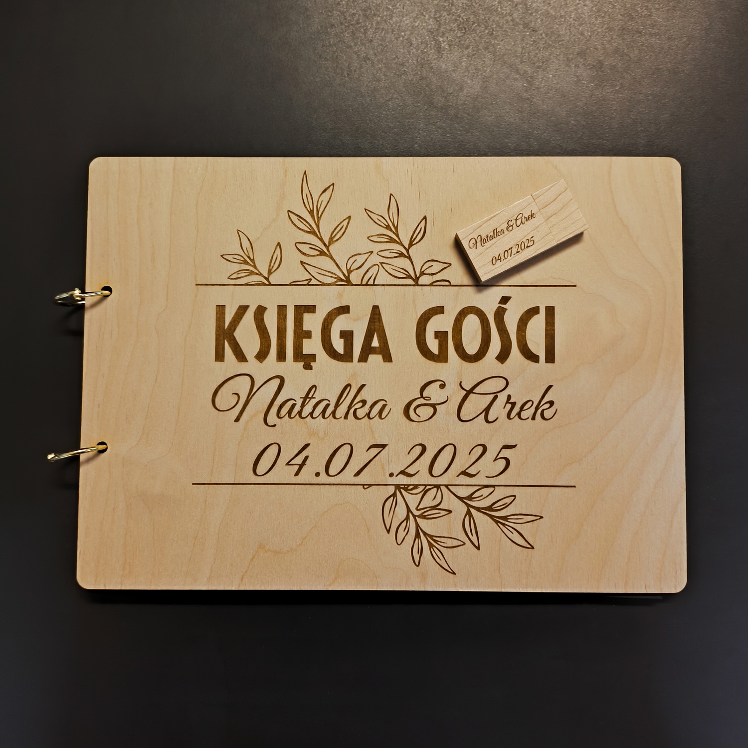 Grawerowana, personalizowana księga gości + grawerowany pendrive 4GB, USB 2.0. Księga zawiera 60 czarnych stron. Okładki wycięte ze sklejki 3mm. Całość spięta kółeczkami w złotym kolorze.