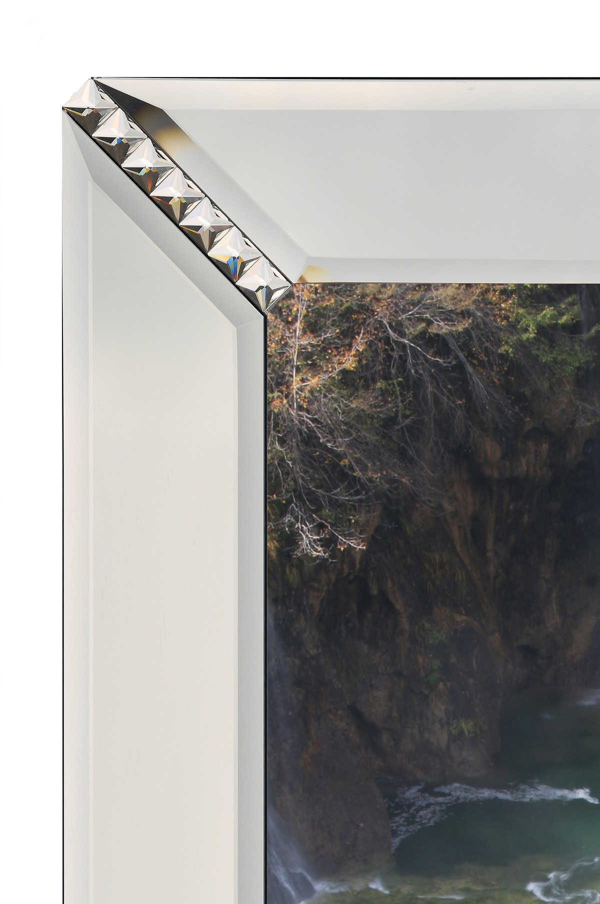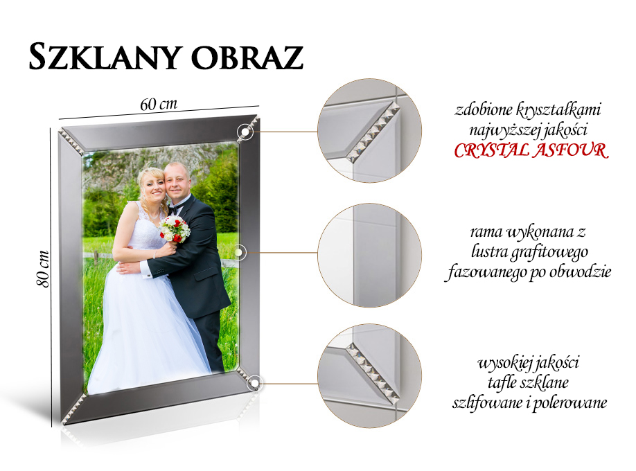 Pamiątka ślubu lub innej ważnej uroczystości – portret wiszący na ścianie Waszego nowego domu będzie wspaniałą pamiątką na lata. Standardowa wielkość obrazu to 80x60cm. Zdjęcie wydrukowane w najwyższej jakości na papierze fotograficznym włożone jest między dwie oszlifowane szyby. Po obwodzie naklejona jest ozdobna ramka z fazowanego lustra grafitowego oraz kryształków Asfour. Wszystkie szklane elementy są najwyższej jakości wykonane bardzo starannie bezpośrednio u czołowego producenta szkła i luster w Polsce. Elementy klejone są ręcznie techniką UV. Z tyłu obrazu montowane są wieszaki do powieszenia oraz odbojniki. Możliwe jest powieszenie w pionie, jak i w poziomie – w zależności od orientacji zdjęcia.