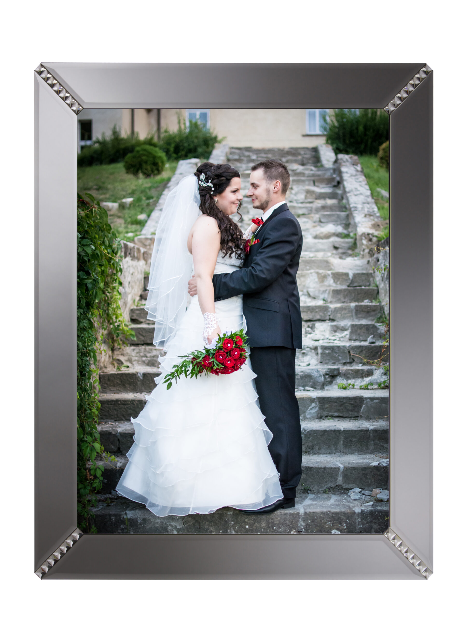 Pamiątka ślubu lub innej ważnej uroczystości – portret wiszący na ścianie Waszego nowego domu będzie wspaniałą pamiątką na lata. Standardowa wielkość obrazu to 80x60cm. Zdjęcie wydrukowane w najwyższej jakości na papierze fotograficznym włożone jest między dwie oszlifowane szyby. Po obwodzie naklejona jest ozdobna ramka z fazowanego lustra grafitowego oraz kryształków asfour. Wszystkie szklane elementy są najwyższej jakości wykonane bardzo starannie bezpośrednio u czołowego producenta szkła i luster w Polsce. Elementy klejone są ręcznie techniką UV. Z tyłu obrazu montowane są wieszaki do powieszenia oraz odbojniki. Możliwe jest powieszenie w pionie, jak i w poziomie – w zależności od orientacji zdjęcia.